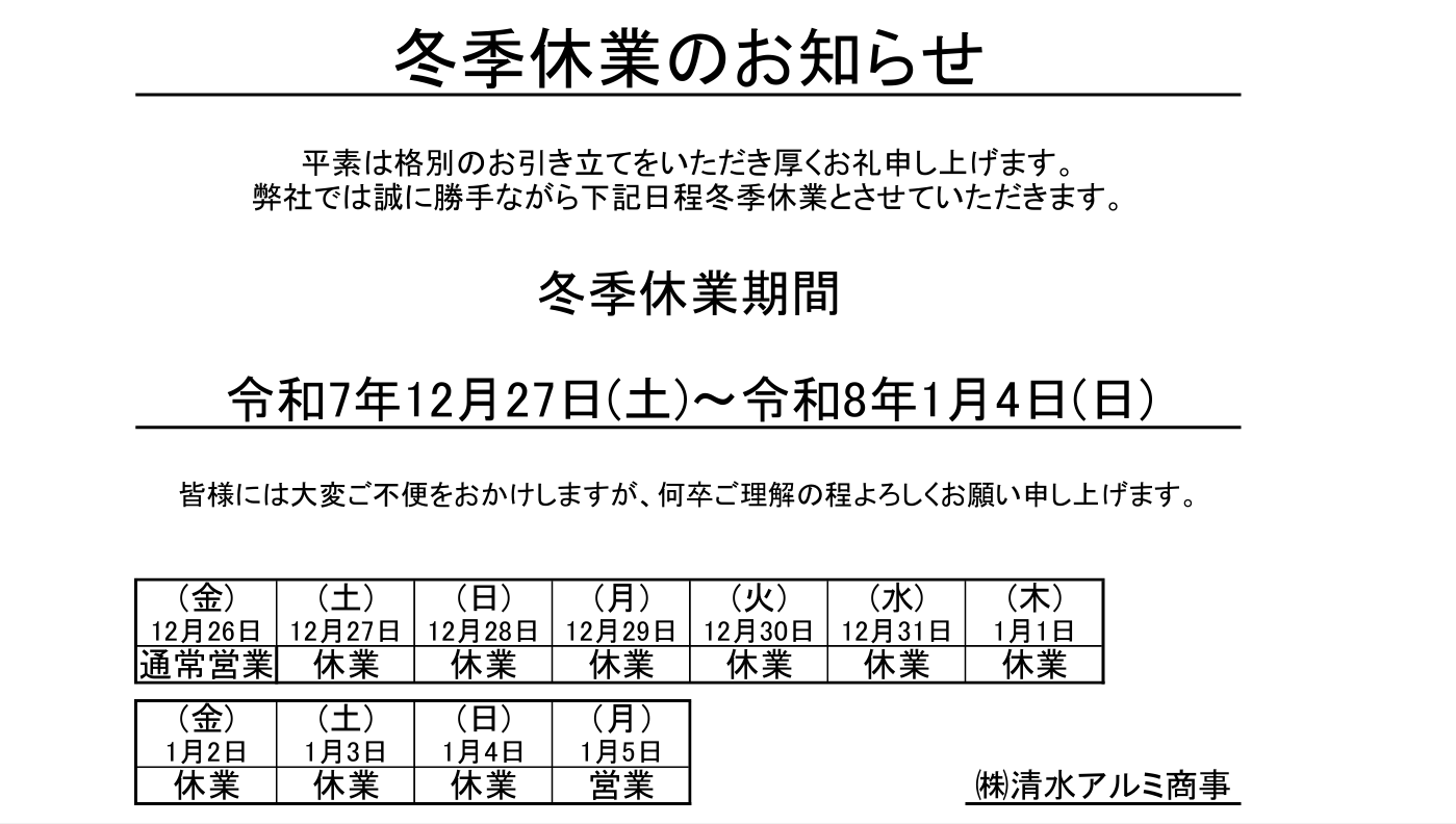 下記の期間を冬季休業とさせていただきますので、よろしくお願いいたします。